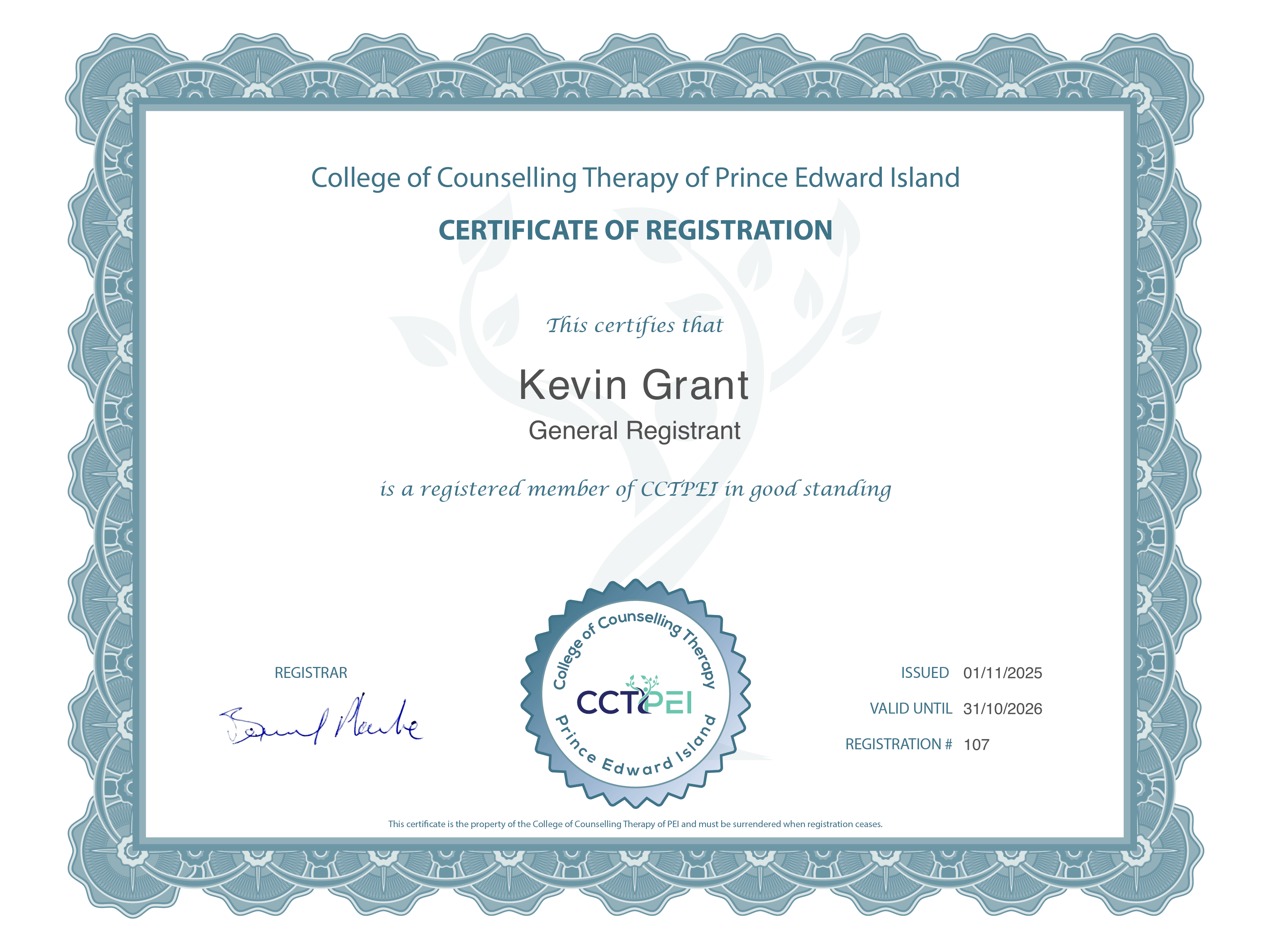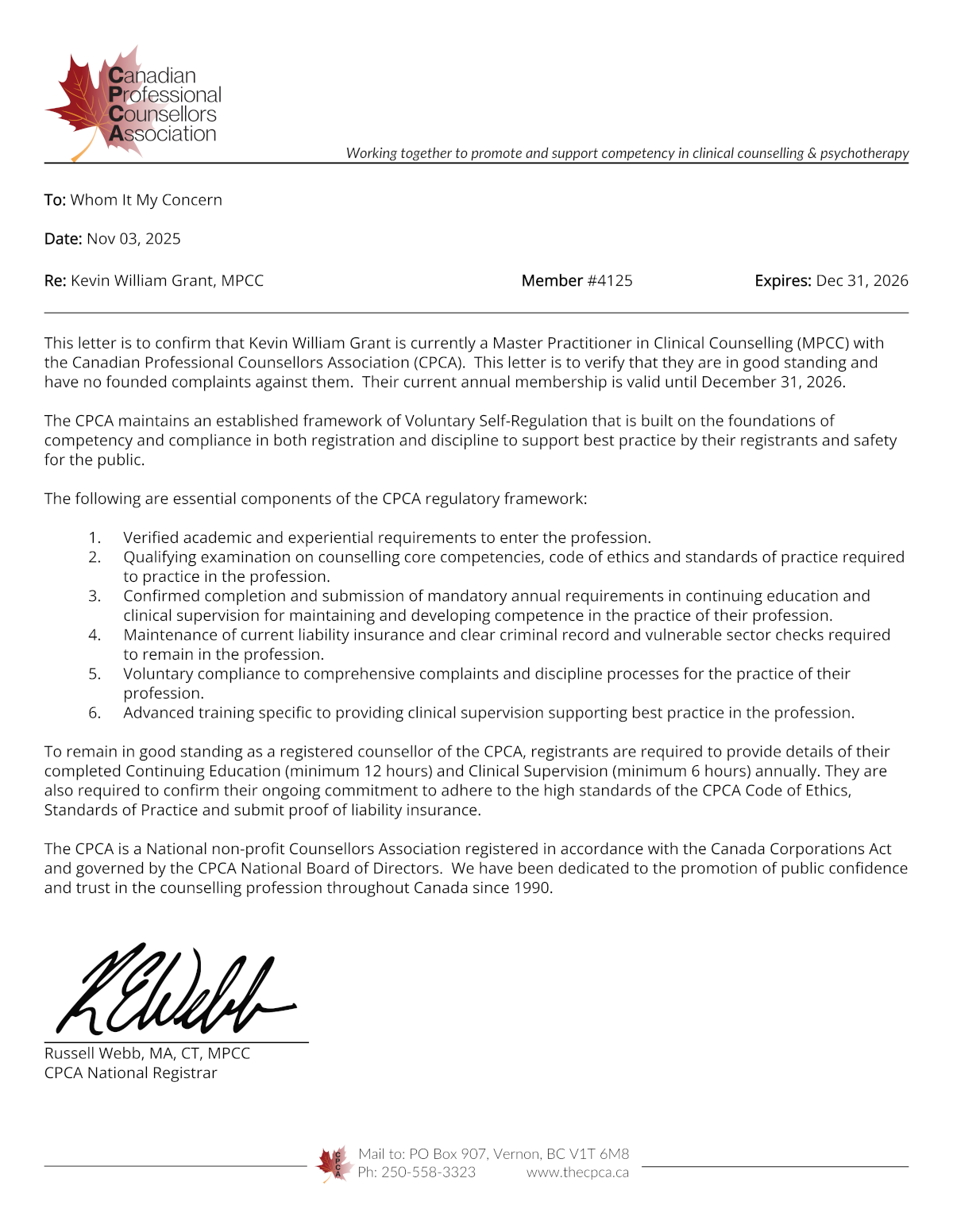 Kevin William Grant adheres to the standards and regulatory requirements of the following organizations: