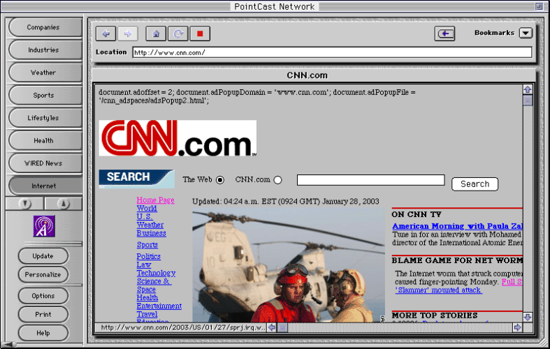 A more likely reason than bandwidth was the increasing popularity of "portal websites". When PointCast first started Yahoo offered little more than a hierarchical structure on the internet (broken down by subject much like DMOZ ) but was soon to introduce the portal which was customizable and offered a much more customizable way to read the news.