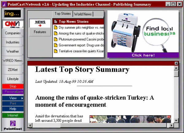 Pointcast software demanded more bandwidth than the home dial-up Internet connections of the day could provide, and people objected to the large number of advertisements that were pushed over the service as well. Pointcast offered corporations a proxy server that would dramatically reduce the bandwidth used. But even this didn't help save PointCast.